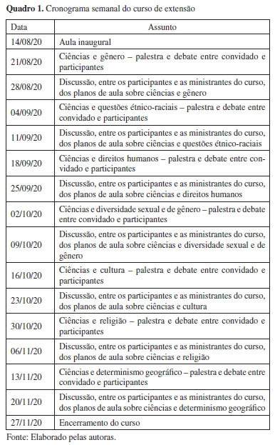 Segundo a perspectiva da análise de discurso de Michel Foucault, é preciso estar no nível da existência das palavras, das coisas ditas. Faz-se necessário não enxergar o discurso como um conjunto de signos, cheio de reais intenções, ou seja, é necessário trabalhar com o discurso, deixando-o aparecer na complexidade que lhe é peculiar. Para o autor, o discurso penetra todos os elementos da experiência, ele está em todo o conjunto, de forma que interliga o conteúdo a qualquer que seja a linguagem à qual pertença. Ainda que haja muitas enunciações, estes tipos de atos discursivos (os enunciados) são raros. Eles diferem dos atos cotidianos porque são atos que são aceitos e aprovados dentro de uma rede discursiva. De acordo com Foucault,26 a arqueologia não visa representar um enunciado como um processo de produção gradual que se desenvolve ao longo do tempo, ou como a realização de um agente ou grupo de agentes sociais. Um sistema de dispersão que atravessa um domínio de objetos e temas é o que se busca. Isso permite a criação de várias opções estratégicas para a produção de um saber. Os planos de aula elaborados pelos professores participantes do curso de extensão foram analisados com o propósito de buscar enunciados sobre a relação entre a educação em ciências e a educação em direitos humanos. Nesta análise, não se está à procura do que está por trás dos planos de aula, o que o docente "realmente" queria explicitar naquela produção, pois para Foucault existem apenas enunciados e relações que o próprio discurso põe em funcionamento. Assim, o enunciado, diferentemente dos atos de fala e mesmo das palavras ou das frases, não é imediatamente visível e nem está inteiramente oculto, "o enunciado é, ao mesmo tempo, não visível e não oculto" (p. 124).26 Logo, "chamaremos de discurso um conjunto de enunciados, na medida em que se apoiem na mesma formação discursiva" (p. 143).26 Um corpus de pesquisa composto por estes pensamentos sobre a relação entre a educação em ciências e a educação em direitos humanos pode ser considerado um enunciado. Como resultado, este corpus de pesquisa nos mostra a estrutura dos discursos atuais sobre direitos humanos. Processo de coleta de dados A coleta de dados ocorreu durante o curso de formação continuada "(Re)pensando as (in)diferenças: as desconstruções e as resistências de temas transversais no ensino de Ciências". As mediadoras do curso foram as autoras deste artigo, que fizeram a coleta de dados ao longo de todo o processo, desde o planejamento do curso, durante toda a sua realização e após o curso, quando seus resultados foram analisados. O curso disponibilizou etapas de palestras, de discussões, de elaboração de planos de aula e de análise destes planos. Os encontros foram gravados pela ferramenta disponibilizada pelo próprio ambiente de videoconferência MConf da universidade em que o curso foi oferecido. O curso de extensão como formação continuada O curso de extensão "(Re)pensando as (in)diferenças: as desconstruções e as resistências de temas transversais no ensino de Ciências da Natureza" foi oferecido a docentes interessados nessa imersão no seu processo formativo, com a produção de conhecimento científico. Professores e professoras que estão atuando em sala de aula percebem que, a cada ano, o Exame Nacional do Ensino Médio (ENEM) investe em questões sociais e éticas na avaliação de Ciências da Natureza, fazendo com que o estudante não apenas faça a relação entre os saberes, mas também enxergue a importância da educação nas suas relações humanas. O objetivo geral do curso era fomentar a formação de identidades abertas à pluralidade cultural, desvencilhada de preconceitos, em uma perspectiva de educação para a cidadania, para a ética nas relações interpessoais e para a crítica às desigualdades sociais e culturais. Seus objetivos específicos eram: (i) estimular o planejamento de aulas e a produção de estratégias e material didático, a partir de temáticas sociais que buscam o empoderamento de grupos postos à margem da sociedade e assumindo uma formação construída com discussões sociais; (ii) discutir a formação humana com as teorias e práticas que a constituem, a fim de perceber o que fundamenta as escolhas e os caminhos de um currículo de Ciências da Natureza; (iii) identificar a viabilidade da aplicação das questões sociais no currículo de Ciências da Natureza no correspondente nível de ensino em que os docentes trabalham; (iv) pensar o ensino de Química como uma interação com a educação social, como um caminho de afirmação para a pluralidade. O curso de extensão foi desenvolvido, no ano de 2020, na modalidade remota síncrona (comunicação que acontece em tempo real), com encontros semanais, por meio da plataforma Mconf da universidade onde o curso foi oferecido. A divulgação foi virtual, através de redes sociais e grupos vinculados a diferentes programas de pós-graduação e, como seria ofertado na modalidade remota, possibilitou que docentes de outras regiões do Brasil se inscrevessem. Foram convidados docentes da área de Ciências da Natureza e suas Tecnologias (Biologia, Física e Química), uma vez que as recomendações atuais da Base Nacional Comum Curricular (BNCC) estimulam o trabalho integrado entre as disciplinas constituintes dessa área. Esses docentes deveriam estar em exercício da profissão, seja na rede pública ou privada, ou serem docentes em formação, alunos de graduação em licenciatura e mestrandos e doutorandos. Os encontros síncronos ocorriam nas sextas-feiras, das 14 h às 17 h 30 min, perfazendo uma carga horária total de 60 horas. Foram oferecidas 40 vagas e 33 participantes concluíram o curso, os quais serão identificados aleatoriamente como P01 a P33 ao longo deste texto. A faixa etária dos participantes variou de 21 a 53 anos, a maioria tendo entre 21 