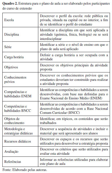 A estrutura esperada para o formato de apresentação dos planos de aula é mostrada no Quadro 2. Os participantes foram estimulados a propor estratégias didáticas para abordagem das temáticas do curso em suas respectivas realidades escolares. Tais estratégias foram apresentadas pelos participantes para os colegas de curso, de modo a compartilhar as ideias, fomentar o debate e aperfeiçoá-las com vistas a futura aplicação em sala de aula da educação básica.
