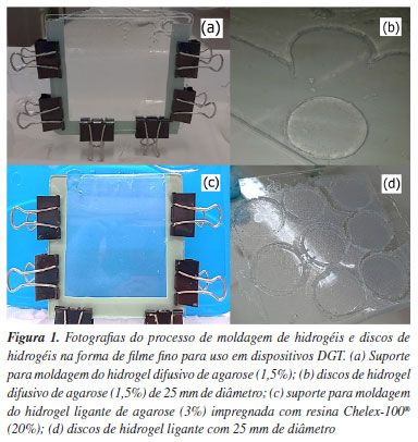RESULTADOS E DISCUSSÃO Características dos hidrogéis difusivo e ligante à base de agarose Os hidrogéis difusivos preparados com 1,5% de agarose podem ter características de poro aberto, pois não foi utilizado nenhum tipo de agente reticulador no preparo.11,12 Conforme Figuras 1a e 1b, os discos de hidrogéis se apresentaram translúcidos, sem a presença visual de bolhas de ar e resistência física satisfatória para uso em dispositivos DGT. Os discos difusivos de agarose foram hidratados e condicionados em solução de eletrólito de suporte, imediatamente após a moldagem. Após intumescimento, a espessura medida dos discos difusivos foi em média 0,86 ± 0,02 mm para discos de 25 mm de diâmetro. Por se tratar de um hidrogel físico, pequenas alterações podem ser observadas no seu inchaço (intumescimento) em função do tempo de hidratação. Os hidrogéis dos dispositivos convencionais de DGT18 apresentam composição de poliacrilamida com reticulador derivado de agarose e possuem 25 mm de diâmetro e espessura de 0,8 mm. Colaço et al.12 estudaram o preparo e uso de gel difusivo com 1,5 e 3,0% de agarose a ser utilizado como fase alternativa em dispositivo DGT. A espessura média dos géis difusivos foram 1,00 ± 0,05 mm. Wang et al.13 estudaram o uso de agarose como fase difusiva em DGT para determinação de cátions e ânions. Os autores determinaram a espessura de 0,8 mm para géis com 1,5% de agarose. Portanto, a fase difusiva preparada neste trabalho apresentou espessura similar a outros trabalhos presentes na literatura.