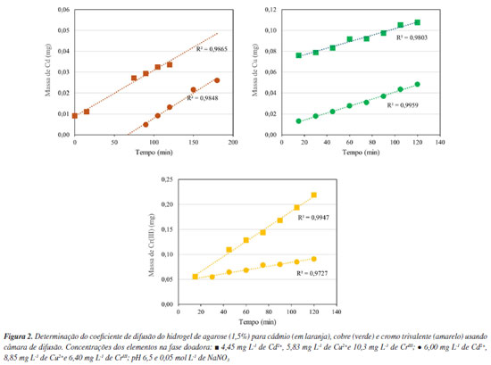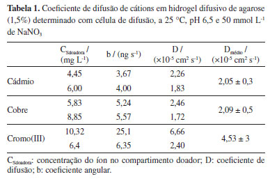 Para todos os casos apresentados na Figura 2, pode-se observar uma relação linear entre as massas acumuladas no compartimento receptor da câmara de difusão em função do tempo, com coeficientes de determinação (R2) acima de 0,97. Os coeficientes angulares (slopes-b) das curvas da Figura 2 foram obtidos e usados no cálculo do coeficiente de difusão (D) para o hidrogel de agarose, de acordo com a Equação 2. Os coeficientes de difusão para os íons de cádmio, cobre e cromo trivalente, a 25 ºC estão apresentados na Tabela 1.