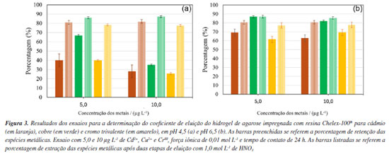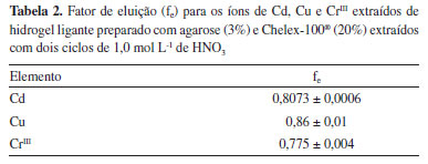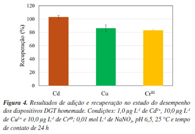 Observa-se na Tabela 2 que os valores de fator de eluição variaram entre 0,775 e 0,86 para a fase ligante proposta com agarose e Chelex-100®. Nota-se que a estimativa de desvio padrão para os ensaios apresenta valores bastante baixos. Zhang e Davison11 consideraram 0,8 como fe para o hidrogel de poliacrilamida e Chelex-100®. Portanto, os resultados obtidos podem ser considerados adequados, indicando a eficiência da fase ligante proposta para uso no dispositivo DGT. Avaliação dos dispositivos DGT homemade baseados no uso de agarose Os dispositivos DGT preparados com hidrogel de agarose na fase difusiva e com hidrogel de agarose impregnado com Chelex-100® foram avaliados com testes de adição e recuperação. Observa-se na Figura 4 que a percentagem de recuperação para os íons de cádmio, cobre e cromo trivalente foi acima de 80%. Também é possível notar na Figura 4 os baixos valores de estimativa de desvio padrão. Portanto, os resultados indicam valores de exatidão e precisão satisfatórios. Dessa forma, os dispositivos DGT homemade podem ser considerados adequados para o uso em meio aquoso.
