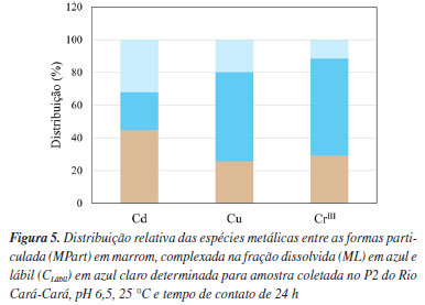 As concentrações totais para o P2 do Rio Cará-Cará variaram entre 0,57 e 2,9 µg L-1 e seguiram a ordem CrIII > Cu > Cd. Os teores totais determinados foram inferiores aos valores preconizados para rios classe 2 pelo Conselho Nacional do Meio Ambiente (CONAMA),23 que indicam valores totais máximos permitidos de 1,0 µg L-1 para cádmio e 50,0 µg L-1 para cromo total. Com relação ao cobre, para classe 2, o valor máximo permitido refere-se a forma dissolvida com 9,0 µg L-1.23 E os teores totais dissolvidos determinados variaram de 0,315 e 2,03 µg L-1 e seguiram a ordem CrIII > Cu > Cd. Portanto, a concentração dissolvida de cobre está abaixo do valor indicado pelo CONAMA.23 A partir dos dados de MTR e MTD é possível estimar a fração particulada (MPart) dos íons metálicos avaliados. No que diz respeito ao fracionamento entre a fração dissolvida e particulada, os analitos apresentaram uma maior percentagem na fração dissolvida, com valores de 55% para Cd, 71% para Cr, 74% para Cu, respectivamente, em relação ao teor de MTR. A fração particulada para o Cd, Cr e Cu representou, 45, 29 e 26% do teor total recuperável, respectivamente. Esses resultados podem indicar que as espécies metálicas podem apresentar maior tempo na coluna de água, permitindo uma interação com a biota aquática.6 Dessa forma, é importante, também conhecer a labilidade das espécies metálicas. As concentrações lábeis (biodisponíveis) foram determinadas com o uso dos dispositivos DGT homemade e foram inferiores a 0,5 µg L-1. A partir dos dados da labilidade das espécies metálicas, foi possível estimar a forma complexada na fração dissolvida. A especiação dos metais traço no ponto 2 do Rio Cará-Cará está apresentada na Figura 5.