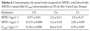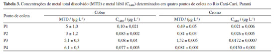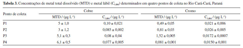 Aplicação de dispositivos DGT homemade na avaliação da labilidade de Cu, Cd e CrIII no Rio Cará-Cará Em um estudo, amostras de água superficial foram coletadas em quatro pontos no Rio Cará-Cará. O primeiro ponto (P1) de coleta está próximo da nascente e apresenta menor atividade urbana e pouca atividade agrícola. O segundo local de coleta (P2) localiza-se após a cidade de Ponta Grossa. O terceiro ponto (P3) sobre influência da região industrial de Ponta Grossa e o quarto ponto (P4) refere-se ao ponto de desague no Rio Tibagi. Para essas amostras, foram determinadas as concentrações totais dissolvidas (MTD) das espécies metálicas e os dispositivos DGT homemade foram aplicados nas amostras durante 24 h (Tabela 3). As concentrações de cromo e cobre foram determinadas, pois os valores foram superiores aos limites de quantificação que foram de 0,05 µg L-1 para Cr e 0,2 µg L-1 para Cu, respectivamente. As concentrações de cádmio não foram quantificadas, pois as concentrações foram inferiores ao limite de quantificação que foi 0,05 µg L-1.