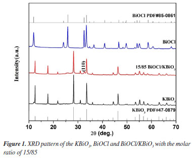 RESULTS AND DISCUSSION X-ray powder diffraction (XRD) analysis For pure KBiO3, it crystallizes in cubic KSbO3 type structure and the XRD patterns match well with the reported patterns for KBiO3 (PDF card No. 47-0879). For the pure BiOCl, all peaks can be indexed to the tetragonal system of BiOCl (PDF card No. 85-0861). For BiOCl/KBiO3 composites with the molar ratio of 15/85, all the diffraction peaks of KBiO3 can be found, and the intensity of the peaks become weaker due to the addition of BiOCl. The characteristic peak of BiOCl (110) can also be observed, but the intensity of the peak is very low because of the low content of BiOCl. Other characteristic peaks of BiOCl are not observed for the same reason. This result shows a coexistence of BiOCl and KBiO3 and suggests that BiOCl and KBiO3 are coupled together successfully.