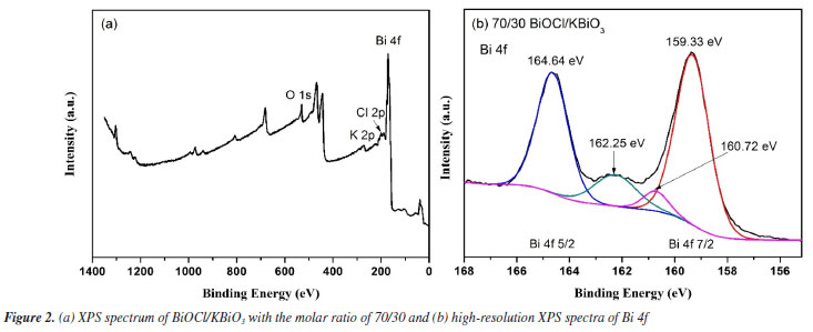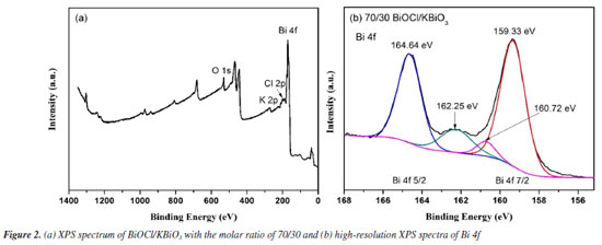 X-ray photoelectron spectroscopy (XPS) analysis The XPS spectrum of BiOCl/KBiO3 with the molar ratio of 70/30 is shown in Figure 2a. The special peaks in the figure demonstrate that the compound is composed of Bi, O, Cl and K elements. Figure 2b shows the characteristic peaks of Bi. The Bi 4f peak shows asymmetrical forms, and the Bi 4f 5/2 and Bi 4f 7/2 peaks are deconvoluted into two bimodal peaks at binding energies of 164.64 and 162.25 eV, and at 159.33 and 160.72 eV, respectively. This result indicates that both Bi3+ and Bi5+ exist in the BiOCl/KBiO3 with the molar ratio of 70/30. Both of the two bimodal peaks show very different intensities. This result can be explained by the very different contents of BiOCl and KBiO3 in the compound. Based on the results of XPS and XRD, it is believed that BiOCl/KBiO3 heterojunction composites are successfully synthesized.