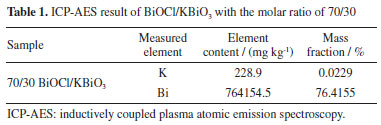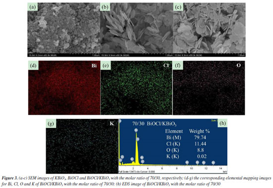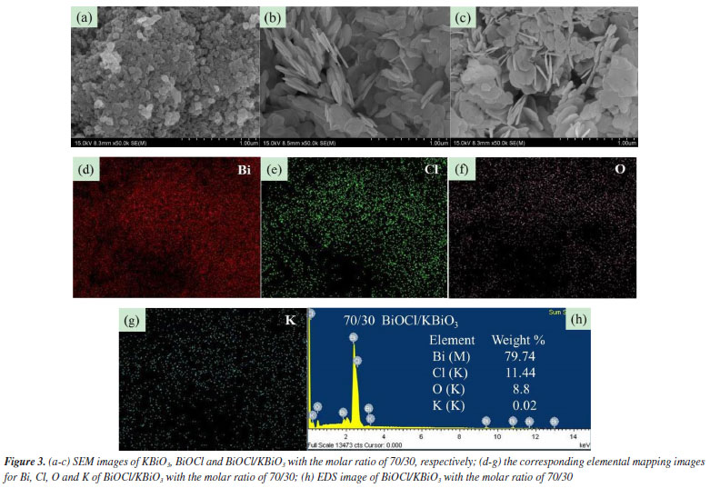 Scanning electron microscope (SEM) analysis The typical SEM images of KBiO3, BiOCl and BiOCl/KBiO3 with the molar ratio of 70/30 are shown in Figures 3a-3c. For pure KBiO3, it is composed of irregularly shaped particles with diameters of 50‑100 nm (Figure 3a). The pure BiOCl comprises many hierarchical mesoporous architectures45 (Figure 3b). BiOCl/KBiO3 with the molar ratio of 70/30 shows hierarchical mesoporous architectures which is similar to the pure BiOCl because of the larger content of BiOCl (Figure 3c). The structure provides a high surface area for BiOCl/ KBiO3 composites, suggesting its strong adsorption ability, and it is beneficial to the separation of photo generated electron-hole pairs. To further investigate elemental composition and distribution uniformity, the elemental maps of the selected area on BiOCl/KBiO3 with the molar ratio of 70/30 are displayed in Figures 3d‑3g, which indicates that homogeneous distribution of Bi, Cl, O and K constituting elements in the sample. These analyses indicate that BiOCl nanoplates are deposited on the surface of KBiO3 particles firmly. All these results further indicate the formation of heterojunctions between BiOCl and KBiO3. In addition, Figure 3h shows the chemical composition of BiOCl/KBiO3 with the molar ratio of 70/30 selected and examined by energy dispersive X-ray spectroscopy (EDS) analysis. The characteristic peaks prove the presence of Bi, Cl, O and K elements, which are also indicative of the BiOCl and KBiO3 components present in the system. No other impurity appears in the system. The Bi content is 79.74 wt.%, close to the theoretical weight (77.07 wt.%). In order to determine the element content more accurately, elemental analysis of the as-prepared samples was performed using inductively coupled plasma atomic emission spectroscopy (ICP-AES). Table 1 presents the actual percentage of K and Bi loaded in the structure of BiOCl/KBiO3 with the molar ratio of 70/30 and shows the Bi content is 76.4155 wt.%, closer to the theoretical weight (77.07 wt.%).