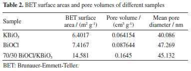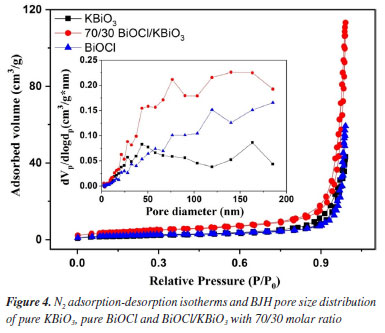 N2 adsorption-desorption analysis The N2 adsorption-desorption isotherms are measured for determining the surface area and porosity of the as-prepared samples. It is well known that the high specific surface area and mesoporous structure can improve the contact of organic pollutants to catalysts resulting in increased photocatalytic activity.46,47 Figure 4 shows N2 adsorption-desorption isotherms and Barrett-Joyner-Halenda (BJH) pore size distribution of the KBiO3, BiOCl and BiOCl/KBiO3 with the molar ratio of 70/30. According to Brunauer-Deming-Deming-Teller (BDDT) classification, the N2 adsorption-desorption isotherms of the KBiO3, BiOCl and BiOCl/KBiO3 with the molar ratio of 70/30 show the type IV curves and have the H3 hysteresis loops at the relative pressure of P/P0 between 0.6-1.0, especially for BiOCl and BiOCl/KBiO3. This originates from the textural porosity of the samples which could be caused by the stacking of the plates-like structure of the composite photocatalysts.45 This result is consistent with the SEM images. The specific surface area and porosity of the KBiO3, BiOCl and BiOCl/KBiO3 with the molar ratio of 70/30 are shown in Table 2. The BET surface area of BiOCl/KBiO3 is much higher than that of KBiO3 and BiOCl, indicating that the high specific surface area leads to the improvement of photocatalytic properties.