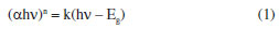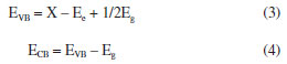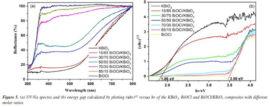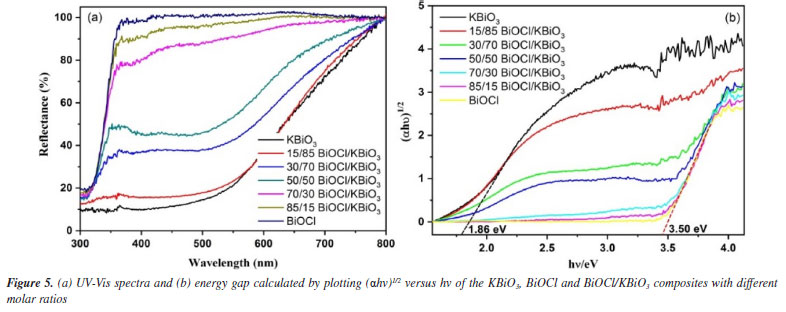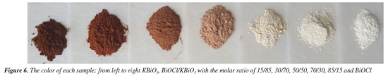 UV-Vis DRS analysis The optical properties of different samples were investigated by a UV-Vis diffuse reflectance spectrum (DRS), and the results obtained are shown in Figure 5a. The absorption edge of BiOCl occurs at about 370 nm. For KBiO3, a strong absorption is detected at wavelength shorter than around 550 nm and sharply declines from approximately 550 nm. The absorption spectra are consistent with the colors of the samples (Figure 6). As BiOCl builds up in the samples, the color becomes lighter. The phenomenon is ascribed to the interaction of heterojunction between BiOCl and KBiO3. The heterojunction can effectively improve the separation of photo-generated electron-hole pairs due to the band gap transition. The band gap (Eg) of semiconductors can be determined from DRS plots as follows:48 ![]()