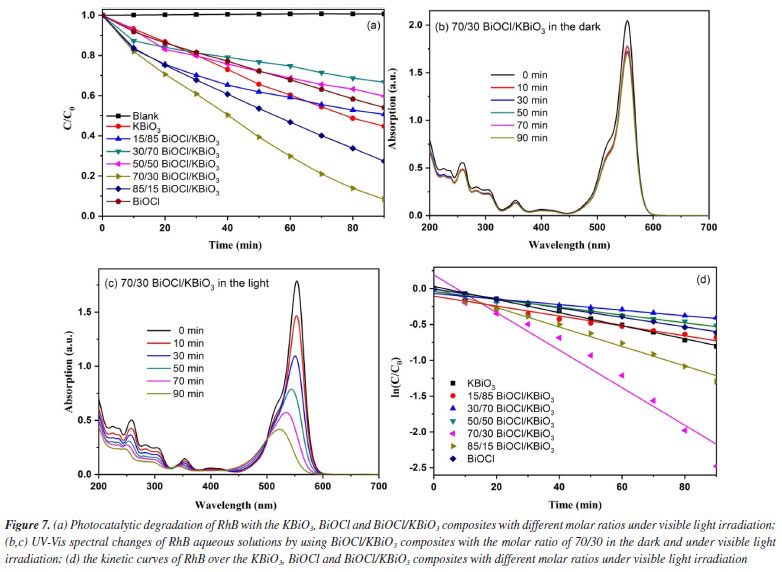where α is the absorption coefficient, h is Planck constant, ν is light frequency, k is proportionality constant, Eg is the band gap energy. Among them, n is determined by the type of optical transition of a semiconductor (n = 2 for direct transition and n = 1/2 for indirect transition). According to the previous report,40 the n value of BiOCl and KBiO3 were all 1/2. From the plot of (αhn)1/2 versus hν in Figure 5b, the estimated band gap energies of the KBiO3 and BiOCl are 1.86 and 3.50 eV, respectively, which are consistent with previous reports.38,43 The band gap energies of the BiOCl/KBiO3 composites with different molar ratios are between those of KBiO3 and BiOCl. On the one hand, the higher band gap energy can inhibit the recombination of the photo-generated electron-hole pairs more effectively than KBiO3 with small band gap energy. On the other hand, it also can enhance the photocatalytic property theoretically. In addition, in Bi-oxides the chemical nature of spectator cation (Li+, Na+, K+, etc.) plays an important role in tailoring the band structure49 as also in stabilizing different oxidation states (+3 to +5) for Bi.39 Photocatalytic activity evaluation The photocatalytic activities of as-prepared samples are evaluated by the degradation of RhB under visible light (λ ≥ 400 nm). Figure 7a displays the photodegradation of RhB as a function of irradiation time over different photocatalysts. A blank experiment without catalysts demonstrates that the concentration of RhB have no noticeable change after irradiation for 90 min. For KBiO3, only 55.3% of the RhB was decomposed in 90 min. This suggests that the rapid recombination between conduction band (CB) electrons and valence band (VB) holes occurs mainly because of the narrow bandgap (1.86 eV) of KBiO3. The photodegradation of RhB with BiOCl is 45.9% after 90 min of irradiation with visible light although it cannot be activated by visible light due to the wide band gap. When comparing these BiOCl/KBiO3 samples, it is noteworthy that the photocatalytic activity of BiOCl/KBiO3 composites showed very different trends with the increasing amount of BiOCl. The BiOCl/KBiO3 sample with the molar ratio of 70/30 shows the highest photocatalytic activity of 91.6% RhB degradation in 90 min. The results indicate that until the suitable BiOCl content in BiOCl/KBiO3 composites, the photocatalytic activity is significantly enhanced, while it is decreased with excess BiOCl content. This may be attributed to the fact that the introduction of a large amount of BiOCl may lead to shielding of the active sites on the photocatalyst surface and weaken the intensity of light arrived to the reaction solution.50 Therefore, it is important to achieve a balance between the active trapping sites, which favoring the inhibition of the recombination of electron-hole pairs, and fewer trapped parts, which leading to a lower capacity for the separation of interfacial charge transfer.51