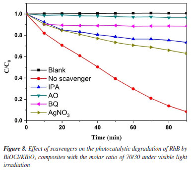 The temporal evolution of the absorption spectra during the RhB physisorption and photodegradation over the BiOCl/KBiO3 with the molar ratio of 70/30 in the dark and under visible light irradiation are shown in Figures 7b and 7c. It is well-known that RhB shows major absorption peak at 553 nm and the intensity of the peak in the spectrum decreases as the concentration of RhB decreases. About 16.9% of RhB decoloration is observed in the dark, which may be due to its plates-like mesoporous structure and large BET special surface. It indicates that the only dark adsorption of RhB with BiOCl/KBiO3 with the molar ratio of 70/30 is negligible. However, in the process of photodegradation within 90 min, it shows an apparently fast decrease in absorption with a concomitant wavelength shift of the band to shorter wavelengths. Under visible illumination, the dye is de-ethylated in a stepwise manner with the color of the dispersion changing from an initial red color to a light green-yellow. The fully de-ethylated RhB molecule has a major absorption band at λmax = 506 nm, in accordance with the standard spectra of RhB. The color of the dispersion disappeared after 90 min of irradiation, indicating that at least the chromophoric structure of the dye was destroyed.52 And no peak shift of RhB was detected indicating that no other intermediate was formed. To quantitatively investigate the reaction kinetics of RhB degradation in our experiment, the experimental data were fitted by applying a first-order model as expressed by Equation 2,53 which is well established for the photocatalytic experiments when the pollutant is in the millimolar concentration range. ![]() where C0 and Ct are the concentrations of RhB in solution at times 0 and t, respectively, and k is the apparent first-order rate constant. The influence of the amount of BiOCl on the photodegradation rate of RhB over the KBiO3, BiOCl and BiOCl/KBiO3 composites with different molar ratios is shown in Figure 7d. From this figure, there is a linear relationship between ln(C0/Ct) and irradiation time, demonstrating that the photocatalytic reaction can depend quantitatively on the pseudo-first-order model.7 The reaction rate constants k of KBiO3, BiOCl/KBiO3 with the molar ratio of 15/85, 30/70, 50/50, 70/30, 85/15 and BiOCl are 0.00914, 0.00691, 0.00389, 0.00545, 0.02621, 0.01358, 0.00660 min-1, respectively. As shown in Figure 7d, when the molar ratio of BiOCl/KBiO3 composites is more than 50/50, the kinetic constants of BiOCl/KBiO3 composites for RhB degradation are higher than that of pure KBiO3 and BiOCl, and the BiOCl/KBiO3 composites with the molar ratio of 70/30 shows the highest value of k (0.02621 min-1), which is about 2.9 and 4.0 times higher than that of pure KBiO3 (0.00914 min-1) and pure BiOCl (0.00660 min-1), respectively. The result reveals that the optimum amount of BiOCl on KBiO3 could extremely facilitate the enhancement of photocatalytic activity of single KBiO3. Mechanism of enhanced photocatalytic activity In order to make sure the prime reactive species which are generated during photocatalytic oxidation process, p-benzoquinone (BQ, •O2– scavenger), isopropyl alcohol (IPA, •OH scavenger), ammonium oxalate monohydrate (AO, h+ scavenger) and AgNO3 (e– scavenger) with the amount of 1 mmol L-1 were added into the reaction system. The effects of four scavengers on the degradation of RhB in the presence of BiOCl/KBiO3 composites with the molar ratio of 70/30 under visible light irradiation are shown in Figure 8. Obviously, the percent of photocatalytic degradation of RhB decreased to nearly zero when AO was added and the similar phenomenon could be found when the BQ, IPA and AgNO3 were added. It indicates that h+, •O2-, ·OH and e- reactive species work together in combination for the photocatalytic degradation of RhB. This result is different from that described by Zhang et al.54