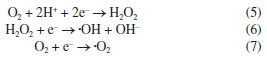 Based on the above results and discussions, in order to further research the separation process of photo-induced carriers, according to the results of DRS, the band edge positions of the valence band (VB) and conduction band (CB) of BiOCl/KBiO3 photo-catalysts can be estimated based on the following empirical equations:49 ![]() where EVB is the band edge positions of VB, ECB is the band edge positions of CB, X is the electronegativity of the semiconductor (which is the geometric mean of the electronegativity of the constituent atoms), Ee is the energy of free electrons on the hydrogen scale (4.5 eV) and Eg is the band gap energy of the semiconductor. As mentioned above, the band gap of KBiO3 and BiOCl is 1.86 and 3.50 eV, respectively. From the above empirical formula, the EVB of KBiO3 and BiOCl is estimated to be 1.89 and 3.90 eV, respectively and the corresponding ECB of KBiO3 and BiOCl is calculated to be 0.03 and 0.40 eV, respectively, as shown in Table 3. The band edge positions of KBiO3 and BiOCl show band alignment as schematically illustrated in Figure 9. As displayed in Figure 9a, the Fermi level and CB of BiOCl are little lower than that of KBiO3 before they are in contact. The Fermi levels of p-type BiOCl is near below, while the Fermi levels of n-type KBiO3 is near above, which seems to be hard to conduct the photocatalytic reaction. However, according to the general p-n heterojunction formation process reported in literatures,55,56 when the p-n heterojunction is formed between KBiO3 and BiOCl, the Fermi levels of KBiO3 and BiOCl tend to descend and rise up to achieve an equilibrium state, and an inner electric field will be formed in the interface of p-n heterojunction. The inner electric field makes the region of BiOCl have negative charges, while the region of KBiO3 has positive charges. In comparison, the conduction band and valence band position of BiOCl are all more negative than that of KBiO3. Under visible light irradiation, only KBiO3 can be activated to generate electron-hole pairs. The inner electric field at p-n heterojunction interface will push the photogenerated holes on the VB of KBiO3 toward that of BiOCl, while the electrons still remain on the CB of KBiO3. In such a way, the photo-induced electrons and holes are efficiently separated and the recombination of electron-hole pairs is hindered.49 In addition, the valence band edge potential of BiOCl is more negative than E0(•OH/H2O) (2.27 VNHE) or E0(OH/HO–) (2.38 VNHE),56 suggesting that the photo-induced holes (h+) on the VB of BiOCl cannot react with H2O or OH– to form •OH. Thus, the photo-induced holes h+ on the VB of BiOCl are consumed to oxide RhB molecules directly. However, the conduction band edge of KBiO3 is less negative than E0(O2/•O2) (–0.33 VNHE) and E0(O2/•HO2) (–0.05 VNHE).57 Therefore, it cannot provide a sufficient potential to reduce O2 through the one-electron reduction process and further form •OH. Therefore, it is reasonable for O2 to react with electrons on the CB of KBiO3 to generate H2O2 (Equation 5) via a two-electron reduction reaction process58-62 (E0(O2/H2O2) = +0.695 VNHE).61 Then the formed H2O2 quickly reacts with an electron to finally form •OH (Equation 6),63 which are highly oxidative active species to many organic pollutants. At the same time, under visible light irradiation RhB molecules can be photosensitized55 and electrons immediately transfer from the excited states of the adsorbed dyes to the conduction band of BiOCl with more negative potential than E0(O2/•O2). Thus, the photosensitized electrons also participate in the oxidation process through the reduction of the adsorbed O2 on the surface of the catalyst to the superoxide radical •O2– (Equation 7). In conclusion the photo-induced holes (h+), hydroxyl radicals (·OH) and superoxide radical (•O2–) which all have strong oxidizing ability for organics work together to break down the chromophores of RhB dye into small molecules, e.g., H2O and CO2.64-70 The process is in good agreement with the results of trapping experiment. This result is also different from that described by Zhang et al.54 The specific reasons need to be further studied in subsequent experiments. ![]()