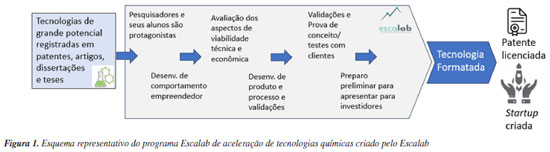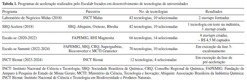 O Escalab (www.escalab.com.br), criado com recursos do Instituto Nacional de Ciência e Tecnologia (INCT) Midas, é um Centro de Inovação do Departamento de Química da Universidade Federal de Minas Gerais (UFMG) que se localiza dentro do Centro de Inovação e Tecnologia (CIT) Senai em Belo Horizonte e nas dependências do Departamento de Química. O Escalab é um centro de escalonamento de tecnologias e modelagem de negócios que tem a missão de fazer a ponte entre as pesquisas realizadas nas bancadas de nossas universidades até a indústria. Para alcançar este objetivo foram desenvolvidas metodologias para o escalonamento como: aumento de escala da tecnologia, em paralelo com estudos de viabilidade técnica e econômica e desenvolvimento de um modelo de negócios. O Escalab presta serviços para universidades e indústrias que vão desde o desenvolvimento de tecnologias (mapeamento tecnológico, pesquisa e desenvolvimento (P&D), escalonamento para protótipos e plantas pilotos), até programas de inovação aberta com indústrias, onde pesquisadores de ICTs de todo Brasil são selecionados para desenvolver desafios apresentados por indústrias, e os programas de pré-aceleração e aceleração de tecnologias, que são objetos deste artigo. No artigo "Processo de Inovação Para Tecnologias Químicas Nascidas em Universidades: Ações do Laboratório Escalab-UFMG" (publicado na Química Nova), Lago e colaboradores5 discutem como o Escalab desenvolve essas tecnologias e que os programas de aceleração representam um caminho possível para tal. Neste artigo descrevemos para a comunidade de química, o funcionamento de um programa de pré-aceleração e aceleração em mais detalhes, usando como estudo de caso o Programa Escale-se, que foi executado por meio de um edital FAPEMIG pelo Escalab.