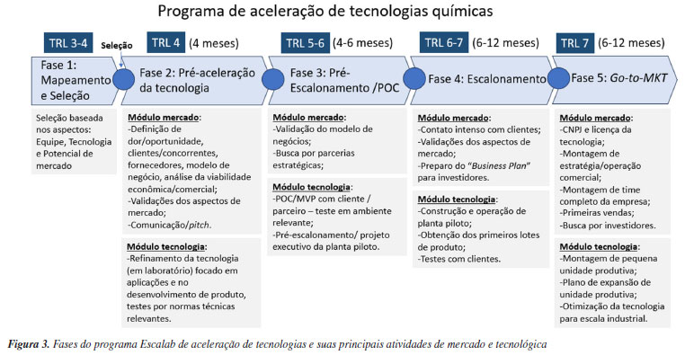 De forma similar, novamente em parceira com o INCT Midas, foi criado o Programa SBQ Acelera com apoio de duas empresas, Oxiteno e Rhodia Solvay, da Associação Brasileira da Indústria Química - Abiquim e da Sociedade Brasileira e Química (SBQ). Foram recebidas 42 inscrições de tecnologias de todo o Brasil, 10 foram selecionadas e participaram de um programa de pré-aceleração por 4 meses. O resultado desse programa foi 1 tecnologia que iniciou o processo de teste com uma empresa e a criação de uma startup, Repair Nanotech, na Universidade Federal de São João del-Rei (UFSJ) que seguiu para um programa de aceleração na Fundação Biominas com investimento de um parceiro privado. Já o programa Escale-se foi realizado utilizando recursos de um edital FAPEMIG com o objetivo de mapear e acelerar para o mercado tecnologias em hard science desenvolvidas em ICTs mineiras. Ao final, a equipe finalista receberia R$ 100.000,00 para o escalonamento da tecnologia e entrada no mercado. A RHI Magnesita foi uma apoiadora do programa. Esta edição do Escale-se será descrita em mais detalhes neste artigo. A segunda edição do Escale-se, o Summit, teve como foco a busca por tecnologias sustentáveis em todo o Brasil. Assim, como a primeira edição, o Summit teve alguns apoiadores: Supergasbras interessada em "Tecnologias para a Produção de Biopropano e Biobutano a Partir de Biomassa Nacional" e o MCTI Granioter interessado em "Tecnologias de Materiais Avançados com Aplicações para Sustentabilidade". Foram 70 soluções inscritas e 10 selecionadas (4 com Cadastro Nacional de Pessoas Jurídicas (CNPJ) abertos - startups). Outro programa de pré-aceleração realizado foi com o Instituto Nacional de Ciência e Tecnologia em Biodiversidade e Produtos Naturais (INCT Bionat), uma rede formada por mais de 50 pesquisadores com foco nas pesquisas em produtos naturais da biodiversidade brasileira. Com o objetivo de avançar no desenvolvimento dessas tecnologias e na criação de startups e/ou transferência de tecnologias, uma parceria foi firmada com o Escalab. Assim, neste momento, estão sendo trabalhados conteúdos para desenvolvimento do modelo de negócios e também conteúdos técnicos para o escalonamento dessas tecnologias. Etapas de um programa Escalab de aceleração O percurso até o mercado para tecnologias na área de química, que se enquadram em hard science, tem características próprias, com elementos específicos de desenvolvimento, técnicos, econômicos e mercadológicos. Um programa Escalab de aceleração de tecnologias tem 5 fases principais: Fase 1 - mapeamento e seleção de tecnologias, Fase 2 - pré- aceleração de tecnologias, Fase 3 - pré-escalonamento/POC, Fase 4 - escalonamento e Fase 5 - tecnologias "go-to-market". A Figura 3 mostra essas fases e suas principais atividades, correlacionando com o TRL (technology readiness level, indica o nível de maturidade das tecnologias).6