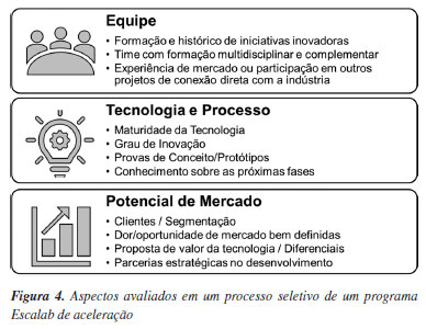 Fase 1: Mapeamento e seleção Esta fase envolve a publicação de um edital/regulamento contendo todas as informações e regras relativas ao processo de aceleração. Uma divulgação assertiva é fundamental para trazer bons projetos para o programa de aceleração. Três aspectos são de grande importância para a seleção: a equipe (professores e alunos que irão se envolver no programa), tecnologia e seu potencial de mercado (Figura 4).