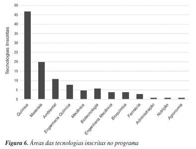 As áreas temáticas das tecnologias inscritas podem ser vistas na Figura 6. As áreas mais frequentes foram química, materiais, ambiental, engenharia química, e outras mais distantes da química como engenharia mecânica e administração.