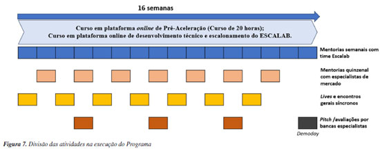 A etapa de seleção das tecnologias aconteceu em junho de 2021 por meio da análise dos formulários e, das 62 propostas inscritas, foram para a fase de entrevistas 34 equipes. As entrevistas tiveram como foco conhecer melhor as tecnologias, avaliar a maturidade da tecnologia, o potencial de mercado e disponibilidade da equipe executora. Foram selecionadas 14 equipes para a primeira fase do programa. A pré-aceleração Escale-se A pré-aceleração teve início com 14 equipes de 7 universidades diferentes, sendo elas: Universidade Federal de Ouro Preto (UFOP), Universidade Federal de Lavras (UFLA), Universidade Federal de Minas Gerais (UFMG), Centro Federal de Educação Tecnológica de Minas Gerais (CEFET-MG), Universidade Federal de Viçosa (UFV), Universidade Federal de Itajubá (UNIFEI) e Universidade Federal de São João del-Rei (UFSJ). O programa é bastante imersivo com atividades durante todas as semanas de execução (Figura 7). Durante os 4 meses dessa primeira fase, as atividades foram agrupadas em: