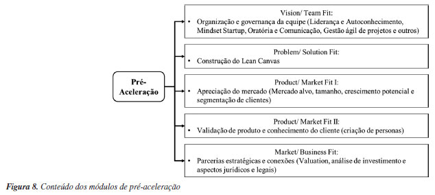 Os conteúdos teóricos do programa, sejam os de mercado (pré-aceleração) ou os tecnológicos (POC/pré-escalonamento e escalonamento), são gravados e disponibilizados nas plataformas do Escalab. Além disso, todas as semanas as equipes têm 1 h de reunião com o time de execução do programa para discussões sobre o desenvolvimento das atividades, dúvidas e também para trazer demandas, como, por exemplo, conexões necessárias para validações do modelo de negócios. Durante o programa é comum que algumas equipes tenham demandas de conteúdo específicas de acordo com sua área ou momento de desenvolvimento. Para essas demandas, são trazidos convidados e especialistas em áreas específicas para abordar assuntos solicitados. Os conteúdos comuns a mais de uma equipe são ministrados na forma de lives para todos os participantes, caso seja um tópico mais singular, é feita uma mentoria específica com a equipe solicitante. Por último, desde o início do programa, as equipes preparam uma apresentação curta, Pitch de 5 min, onde todas as informações pertinentes do negócio e da tecnologia são apresentadas. Bancas externas são montadas com convidados especialistas do mercado para avaliar as equipes e dar opiniões sobre o desenvolvimento e modelo de negócios em construção. O curso de pré-aceleração disponibilizado apresenta uma divisão em 5 módulos, sendo eles: Vision/team fit, Problem/solution, Product/market fit I, Product/market fit II e Business fit (Figura 8).15
