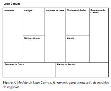 Durante o conteúdo de pré-aceleração, usou-se a ferramenta Lean Canvas13 (Figura 9) para desenvolver os modelos de negócios a partir das tecnologias dos pesquisadores. O Lean Canvas é dividido em blocos, onde cada um traz reflexões sobre o negócio a ser construído. Por exemplo, os blocos Problema, Solução e Proposta de Valor trabalham, respectivamente, as seguintes reflexões: "Qual o problema que sua solução resolve? Esse problema possui prioridade para o seu cliente?", "Como sua solução resolve o problema do cliente?" e "Qual diferencial da sua solução, o que ela oferece de diferente ou melhor quando comparada as outras soluções que são utilizadas hoje pelo cliente?".16