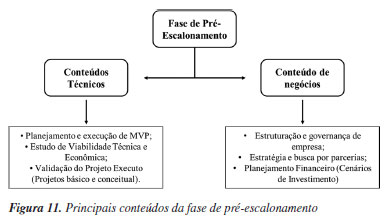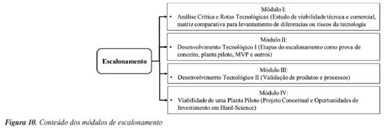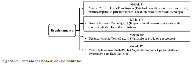 Assim como os módulos de pré-aceleração, os módulos técnicos eram disponibilizados a cada semana e discutidos em detalhes nos encontros semanais. O time Escalab, responsável pelos encontros semanais, era um time diversificado, com os conhecimentos técnicos e experiência em atividades empreendedoras. Durante o encontro semanal e individualizado, de 1 h, as equipes moldavam seu modelo de negócios e discutiam sobre o escalonamento sob o olhar dessa equipe, que apresentava ferramentas e visões críticas para que a cada semana houvesse desenvolvimento do negócio. A cada duas semanas aproximadamente, as equipes apresentavam um Pitch, ou seja, uma apresentação rápida do negócio, em 5 min. Esse era o momento de outros membros do Escalab, além das outras equipes, opinarem e contribuírem para o desenvolvimento daquele negócio. Essa mesma dinâmica, a cada final de mês, era utilizada como uma das avaliações das equipes. Nesta banca avaliativa, geralmente composta por 2 ou 3 pessoas, eram convidadas pessoas do mercado e do ecossistema que não conheciam as equipes do programa para novamente haver uma troca de feedbacks e visões de fora. Ao final dessa primeira fase foram selecionadas 6 equipes para a fase posterior: pré-escalonamento/prova de conceito. A seleção foi feita a partir das médias obtidas pelas equipes durante as bancas avaliativas e qualidade das entregas realizadas durante o programa. Pré-escalonamento/prova de conceito (POC) Para a etapa de pré-escalonamento foram levados 6 projetos e, para isso, fez-se uso de uma estrutura de acompanhamento semanal individual de cada equipe por parte do Escalab. Ao início da etapa foi realizado um diagnóstico com cada uma das tecnologias e foi criado um plano de trabalho detalhado, com objetivo de focar nos pontos críticos de cada uma delas. O objetivo principal desta fase foi validar as premissas do modelo de negócios e buscar parcerias estratégicas para realizar testes do produto em ambiente relevante (POC). Além disso, foi construído um projeto executivo para o aumento de escala seguinte (planta piloto), bem como atualização do estudo de viabilidade técnica e econômica (EVTE) que foi iniciado na fase anterior. Os conteúdos gerais foram ministrados na forma de "lives" para os participantes e são mostrados na Figura 11.