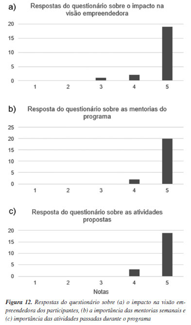 Também foi perguntado aos participantes o quão efetivo foram as mentorias com os facilitadores do Escalab, encontros semanais de 1 h com o objetivo de ajudar no desenvolvimento, contribuir com feedbacks, tirar dúvidas e facilitar conexões. Cerca de 90% dos participantes deram nota máxima, 5 (Figura 12b). Sobre a segunda fase, de pré-escalonamento, quando questionados sobre as atividades e entregas propostas que envolveram o projeto conceitual, planilhas de precificação e outras atividades, 19 dos 22 entrevistados (86%) deram nota máxima, classificada como "muito bom" (Figura 12c). O que indica que a metodologia foi efetiva para apoiar a construção do negócio em criação. Sobre o programa como um todo, seguem alguns comentários de pesquisadores: