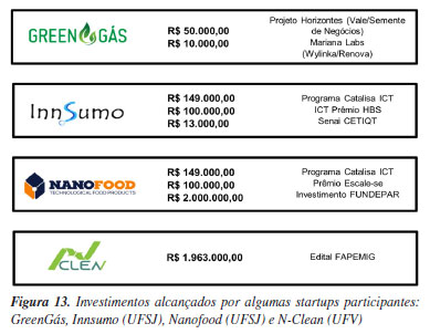 Entre os participantes que deram nota mais baixa, algumas das justificativas foram a falta de conteúdos mais específicos como legislações exclusivas de seus produtos e aspectos particulares de abertura de empresa e contratação. Eles relataram, porém, que essas informações foram fornecidas pelas conexões e contatos realizados ao longo do programa. "Senti falta de conteúdos mais específicos de legislação para startups, cuidados para abertura de empresa, contração e etc. Porém, isso não foi um problema para nossa equipe, pois buscamos essa informação com networks criados." Em contato posterior, após a finalização do programa, com as equipes participantes, quatro startups abriram CNPJ ou estavam em processo de abertura. Ou seja, cerca de 28% das tecnologias estão no caminho de se tornarem spin-offs acadêmicas. Outro ponto interessante do empreendedorismo acadêmico e dos programas de inovação aberta são as habilidades adquiridas pelos participantes. Mesmo que uma startup perceba durante o programa que possui um modelo de negócio inviável, ou mesmo com todo o potencial não se classifique para as últimas fases programa, os conhecimentos adquiridos são ferramentas importantes para se conectar a outras oportunidades. Alguns exemplos disso são startups que participaram do Escale-se, mas que conseguiram recursos de outras fontes durante e após o programa (Figura 13).