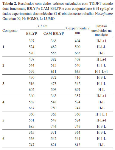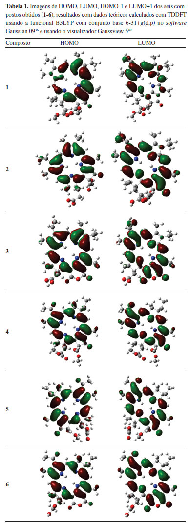 Os derivados de clorina apresentam uma absorção de banda Q bem característica na região de 660 nm e as bacterioclorinas na região de 750 nm. No entanto, estas bandas podem variar para mais ou para menos, dependendo do tipo de substituinte ligados a estes derivados porfirinóides.3 Sendo assim, é necessário validar o método teórico comparando os espectros experimentais com os teóricos. Após a validação, é possível prever teoricamente o efeito de novos substituintes e metais na banda de absorção e com isso é possível prever qual a melhor modificação química que deve ser feita para que se obtenha um espectro de absorção na região desejada. Esta previsão das bandas Q é bastante importante, uma vez que estes compostos são utilizados na terapia fotodinâmica, por exemplo, é desejável que apresentem espectros de absorção na região entre 750 e 800 nm. Neste comprimento de onda, é onde ocorre a maior penetração da luz no tecido, tornando-o mais efetivo para tratamento de infeções mais profundas, e nesta faixa de comprimento de onda a luz não causa danos ao tecido saudável.3 Neste trabalho, além de obter os espectros experimentais, foram calculados os espectros de UV-Vis para as seis moléculas semi-sintetizadas. Foi usado o método computacional TDDFT e com auxílio do software Gaussian 09,36 foram obtidos dados teóricos a serem comparados com os espectros experimentais, onde foi possível obter as frequências de oscilador (f), comprimentos de onda λ (nm) e orbitais envolvidos nas transições eletrônicas basicamente entre HOMO - LUMO, HOMO-1 e LUMO+1 (Tabela 1). Na Tabela 2, temos a comparação entre os dados experimentais e teóricos.