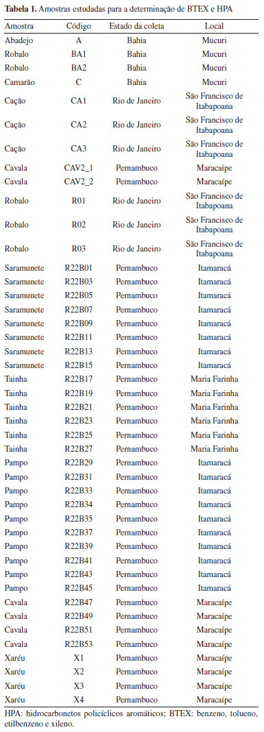 PARTE EXPERIMENTAL Padrões e reagentes Os solventes acetonitrila, hexano e metanol foram todos de grau cromatográfico (HPLC) das marcas Sigma-Aldrich (Saint Louis, Estados Unidos), Panreac (Castellar del Vallès, Espanha), JT Baker (Cidade do México, México) ou similares. Para o estudo, foram empregados padrões analíticos de alta pureza (> 95%) de 5 BTEX (benzeno, tolueno, etilbenzeno, m- + p-xileno e o-xileno), de 16 HPA prioritários (naftaleno, acenaftileno, acenafteno, fluoreno, fenantreno, antraceno, fluoranteno, pireno, benzo[a]antraceno, criseno, benzo[b]fluoranteno, benzo[k]fluoranteno, benzo[a]fluoranteno, benzo[a]pireno, indeno[1,2,3-cd]pireno, dizenzo[a,h]antraceno, benzo[g,h,i]pireleno), de 5 padrões de HPA deuterados (acenafteno-2H10, criseno-2H12, fenantreno-2H10, naftaleno-2H8 e perileno-2H12) e 1 padrão interno deuterado (p-Terfenil-2H14), todos da marca Merck/Sigma-Aldrich (Saint Louis, Estados Unidos). As soluções estoques dos padrões BTEX e PAH foram preparadas em metanol e diclorometano, respectivamente, em concentração de 80,0 mg L-1. Estas foram mantidas no freezer (–18 ºC) até o momento do preparo das soluções intermediárias e de trabalho. Local de estudo e amostragem As amostras de pescado foram adquiridas de pescadores locais, aproximadamente dois anos e meio após o surgimento das manchas de petróleo em 2019. Os locais de coleta foram: regiões costeiras da Bahia, Pernambuco e Rio de Janeiro. Após a coleta, o tecido muscular das amostras foi liofilizado e encaminhado para o Laboratório de Análises Ambientais do Grupo de Química Ambiental (GQA) da Universidade Federal Paraná, para determinação de BTEX e HPA. Ao total foram analisadas 44 amostras. A relação das amostras avaliadas, bem como o código e local de coleta estão descritos na Tabela 1.
