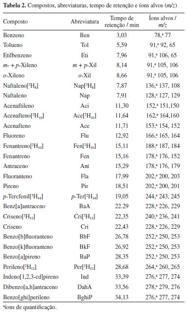 Extração de BTEX e HPA As concentrações de BTEX foram determinadas nas amostras de pescado empregando condições modificadas de extração descritas no método EPA Method 8265.15 Para a extração, 1 g da amostra previamente liofilizada em liofilizador Liobras L101 (São Carlos, Brasil) e triturada foi transferida para vials headspace de 20 mL. Em seguida, 10 mL de metanol foi adicionado a amostra. O vial foi fechado com tampa rosqueável contendo septo em politetrafluoretileno (PTFE) e em seguida a amostra foi submetida a agitação em vortex Ika modelo vortex 1 (Staufen, Alemanha) por 1 min e uma alíquota de 200 µL do extrato foi transferida para outro vial de headspace e o volume completado para 5 mL com água ultrapura purificada em sistema Millipore Simplicity (Molsheim, França). O vial foi fechado e encaminhado para quantificação com a técnica de cromatografia gasosa acoplada a espectrometria de massas com injeção por headspace (HS-GC-MS), de acordo com os parâmetros instrumentais descritos na seção "Determinação dos HPA e BTEX por GC-MS". Os HPA foram extraídos das amostras empregando o método de saponificação. A saponificação com uma base é sugerida para quebrar componentes como proteínas e lipídios, nos quais os HPA podem ser adsorvidos, para posterior separação usando solventes orgânicos.16 O método empregado foi baseado no protocolo de Da Silva et al.17 Para a extração com saponificação, alíquotas de 0,25 g de amostra liofilizadas e maceradas foram adicionadas em um tubo de vidro de 100 mL juntamente com 100 µL dos padrões sub-rogados em concentração de 200 ng g-1. No frasco, foram adicionados 4,0 mL de solução saturada de hidróxido de potássio (KOH), preparada em metanol, na concentração 2 mol L-1 e 10 mL de hexano. Posteriormente, o frasco foi vedado e submetido a aquecimento em banho-maria Fisatom 550 (São Paulo, Brasil) por 1 h a 70 ºC. Finalizado o processo, após o resfriamento, uma alíquota de 6 mL da fase orgânica foi filtrada em filtro de PTFE hidrofílico de porosidade de 0,45 µm. A purificação (clean-up) do extrato foi realizada em uma coluna de vidro com dimensões de 115 × 15 mm contendo 500 mg de C18. A coluna foi empacotada com 4 mL de diclorometano e condicionada com 4 mL de diclorometano e hexano (1:1). Em seguida, 6 mL da amostra foi transferido para a coluna e eluída com 10 mL da mistura diclorometano e hexano. Consecutivamente, 10 mL do eluato foi coletado em tubo de vidro de 12 mL e concentrado em evaporador rotativo a vácuo Christ, modelo RVC 2-18 CD Plus (Osterode am Harz, Alemanha) operado a 60 ºC em rotação de 1500 rpm. O extrato foi solubilizado com 1000 µL de solução de p-tercfenil-D14 preparado em hexano, na concentração de 100 µg L-1 e analisado por GC-MS. Determinação dos HPA e BTEX por GC-MS A separação, identificação e quantificação dos BTEX e HPA foram realizadas em um cromatógrafo a gás Shimadzu QP2010 Plus (Kyoto, Japão) equipado com uma coluna capilar analítica Phenomenex ZB-5ms (Califórnia, Estados Unidos) 30 m × 0,25 mm × 0,25 µm acoplado a espectrômetro de massa, TQ8040 e um amostrador automático, Combi Palm Shimadzu AOC-5000 Plus. O equipamento foi operado com hélio analítico de alta pureza 99,999% como gás de arraste em vazão constante, fornecido pela White Martins (Paraná, Brasil). As determinações de BTEX foram realizadas por HS-GC-MS. Neste procedimento, o vial contendo a amostra é aquecido (60 ºC) e agitado (250 rpm) durante 5 min. O aquecimento promove a volatilização dos analitos, deslocando o equilíbrio para a fase gasosa, localizada no volume morto do frasco ou headspace. Por fim, uma seringa cromatográfica aquecida (60 ºC) e controlada por amostrador automático perfura o septo do frasco, coletando apenas um volume pré-determinado da fase gasosa (500 µL) e injetando a amostra no GC-MS para quantificação. O instrumento foi operado usando 1,00 mL min-1 de gás de arraste com vazão constante, injeção no modo splitless a 180 ºC sem pulso de pressão. A coluna foi mantida a 35 ºC por 5 min, seguida de aquecimento a 10 ºC min-1 e por fim, um gradiente de 30 ºC min-1 a 200 ºC, sendo mantido por 2 min. A linha de transferência e a fonte de íons foram mantidas a 250 ºC. Para HPA, a injeção foi realizada empregando 1 µL do extrato em modo splitless a 270 ºC. O programa de aquecimento foi de 40 ºC por 2 min, aumentado a uma taxa de 50 ºC min-1 a 80 ºC, depois aumentado de 10 ºC min-1 a 240 ºC (2 min de espera), de 240 a 260 ºC a uma taxa de 4 ºC min-1 (5 min de espera) e por fim, a uma taxa de 20 ºC min-1 a 300 ºC (7 min de espera) (tempo de execução = 39,8 min). A linha de transferência e da fonte de ionização foram mantidas em temperatura de 280 e 230 ºC, respectivamente. As determinações de BTEX e HPA foram realizadas em modo de monitoramento seletivo de íons, SIM. A Tabela 2 apresenta as informações de abreviatura, tempo de retenção e íons alvo dos analitos investigados.18
