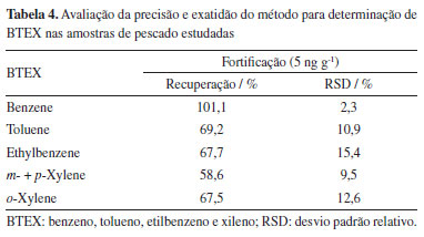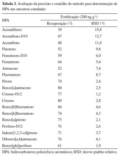 RESULTADOS E DISCUSSÃO Curvas analíticas e ensaios de recuperação para HPA e BTEX A determinação dos HPA foi realizada por meio de curvas analíticas instrumentais com sete níveis de concentração na faixa entre 5-250 µg L-1, em que os coeficientes de determinação obtidos foram entre 0,9956 e 0,9996. Em seguida, por meio da curva analítica, foram calculados os LOD e LOQ, sendo LOD de 2 ng g-1 e LOQ de 5 ng g-1. Foram obtidos valores médios de recuperação de 77 ± 1,2% para criseno-D12 e 76 ± 2,6% para perileno-D12, com incertezas (RSD) inferiores a 22%. Deste modo, a menor recuperação alcançada foi de 39 ± 15,8% para o acenaftileno e a maior de 84 ± 5% para o benzo[b]fluoranteno. Os dados de recuperação estão demonstrados na Tabela 3.
