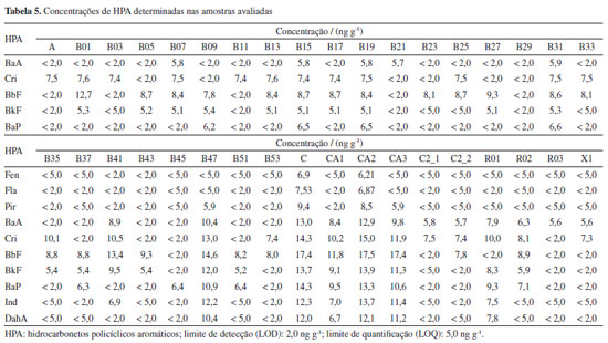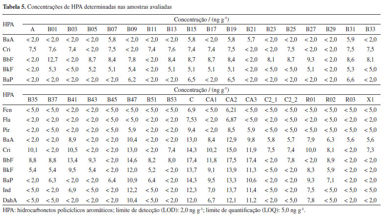 Portanto, por meio dos dados obtidos com os ensaios de recuperação, sugere-se que o método empregado possui potencial para ser utilizado na determinação de HPA em amostras de pescado com maior teor de gordura, como as analisadas neste estudo, como por exemplo o pampo, que pode ter até 14% de teor de gordura, enquadrando-se na classe de peixes gordurosos (teor de gordura acima de 10%).25 Para os ensaios de BTEX, os coeficientes de determinação obtidos foram entre 0,9993 e 0,9849 e a partir dos ensaios de recuperação, foram obtidas recuperações na faixa de 58,6 ± 9,5 e 101.1 ± 2,3%, demonstrados na Tabela 4. BTEX e HPA em amostras de pescado Conforme os dados obtidos neste estudo, os compostos BTEX não foram detectados nas amostras analisadas, considerando o limite de detecção de 0,02 µg g-1 de massa úmida. Em relação à determinação de HPA, entre as 44 amostras analisadas, 36 indicaram a presença dos compostos aromáticos avaliados. A relação da concentração de cada HPA encontrado nas amostras está demonstrada nas Tabelas 4 e 5. Os HPA foram quantificados a partir do fenantreno, para as amostras CA2 e C, com concentrações de 6,21 e 6,90 ng g-1 respectivamente. A concentração máxima de HPA encontrada foi de 17,5 ng g-1 para a amostra CA2. Os resultados sugeriram maior contaminação para as amostras C, da Bahia, CA1, CA2 e CA3, amostradas no Rio de Janeiro e a amostra B47, obtida em Pernambuco, com maiores concentrações dos contaminantes e também pela maior frequência de quantificações de 11 HPA avaliados.