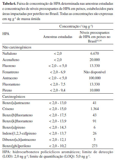 Estes resultados são similares àqueles descritos por Magalhães et al.,11 que também avaliaram a contaminação de amostras de pescado pelo derramamento de petróleo em 2019 na costa brasileira, identificando contaminações em uma faixa de concentração de 8,71 a 418 ng g-1. Conforme o estudo, no geral, maiores concentrações foram encontradas para os HPA de menor massa molecular como o naftaleno, condição esta que difere parcialmente dos dados obtidos neste estudo. Em outro estudo, realizado por De Melo et al.,26 com amostras de pescado de diferentes regiões do Brasil em 2019, os HPA benzo[a]antraceno, benzo[a]pireno, ebenzo[b]fuoranteno foram os HPA mais frequentes, variando de < LOQ (5,0 ng g-1) a 113 ng g-1. Apesar da similaridade de contaminação para algumas amostras avaliadas, observa-se que a maior concentração encontrada nos estudos realizados por Magalhães et al.11 e De Melo et al.26 foram superiores às encontradas no presente trabalho. Entretanto, é importante ressaltar que o presente estudo avaliou amostras coletadas 30 meses após o acidente de 2019 e que, portanto, os resultados sugerem presença residual destes compostos em amostras de pescado. Também é importante salientar que neste estudo, as amostras coletadas na região Nordeste do país apresentaram concentrações menores de HPA, em média, quando comparadas às amostras coletadas no Norte Fluminense. Embora, no geral, todas as espécies coletadas façam parte de nível trófico elevado, com tendência a acumulação de contaminantes, apenas no Norte Fluminense foram avaliados os cações, da classe dos elasmobrânquios. Segundo Martins et al.,27 os elasmobrânquios, uma subclasse de peixes caracterizados por possuírem cartilagem no lugar de ossos, tendem a acumular altos níveis de contaminantes devido as posições tróficas mais elevadas, atuando como predadores meso e de ápice, além de serem mais longevos. Estes autores estudaram uma espécie de raia viola e observaram altas concentrações de HPA em músculos destes animais, indicando uma contaminação crônica nos indivíduos estudados. Em outro estudo também foi observada a transferência materna de HPA, identificando principalmente o benzo[b]fluoranteno como o composto com maior taxa de transferência. Mesmo considerando que são espécies diferentes de elasmobrânquios, estes resultados sugerem que as concentrações mais altas nas amostras de cação podem estar relacionadas às espécies, mas também à classe de compostos, do que apenas a uma contaminação pontual.28 Em outros trabalhos ao redor do mundo, também é possível encontrar concentrações similares, e em locais onde a atividade industrial relacionada a petróleo é intensa, a concentração mostra-se ainda maior. Por exemplo, em amostras de peixes coletadas em uma área com intensa atividade petroquímica no Oriente Médio (Al-Jubail, Arábia Saudita), autores29 relataram níveis de HPA de 0,29 ng g-1 para o benzo[a]pireno e 158,39 ng g-1 para o acenafteno. Outro trabalho realizado por Ju et al.6 também avaliou a presença de HPA em diferentes espécies de peixes, onde os valores variaram de 43,0 ± 11.3 a 20,0 ± 5,8 ng g-1, entretanto, benzo[a]pireno não foi detectado nas amostras, sendo este um composto com potencial cancerígeno entre os HPA. Em geral, a rápida depuração e biotransformação de alguns HPA em produtos do mar pode resultar no seu desaparecimento ou redução nas concentrações. Avaliação de risco No Brasil, após o acidente do derramamento de óleo de 2019, a ANVISA14 elaborou uma nota técnica a respeito dos riscos à saúde humana decorrentes do consumo de pescados oriundos das praias contaminadas por óleo cru na região Nordeste do Brasil. Nesta nota está descrito o nível de preocupação para compostos carcinogênicos genotóxicos em relação aos HPA. Desta forma, por meio dos dados de concentração de nível preocupante expostos pela ANVISA14 e por Magalhães et al.,11 foi possível realizar uma análise a respeito do nível de contaminação das amostras avaliadas neste projeto, demonstrada na Tabela 6.