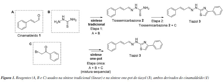 Arlan de Assis GonsalvesI,II; Victória Laysna dos Anjos SantosIII I. Colegiado de Ciências Farmacêuticas, Universidade Federal do Vale do São Francisco, 56304-917 Petrolina - PE, Brasil Recebido: 27/04/2024 *e-mail: cleonia.araujo@univasf.edu.br In this work we explore some theoretical and practical aspects of one-pot synthesis. The focal point of the study is the preparation of the thiazole heterocycle, with an emphasis on theoretical aspects of the organic and medicinal chemistry of this important privileged structure. The entire set of experimental procedures and characterization steps explored in this work has the potential to assist in the training and/or technical improvement of undergraduate students, and contribute to the teaching of chemistry in Brazilian higher education. It is worth emphasizing these aspects because the experiments shown in the proposed practices involve simple, rapid, low-risk, and low-cost procedures, making it perfectly feasible to reproduce them in undergraduate classes, even in laboratories with limited material resources. INTRODUÇÃO Nos últimos anos, publicações científicas em Química Orgânica e Química Medicinal vem combinando conceitos de síntese orientada pela diversidade estrutural, estruturas privilegiadas, núcleos heterocíclicos e/ou síntese one-pot em seus processos de pesquisa e desenvolvimento de novos fármacos.1 Diante de conceitos diferentes, que podem parecer um tanto abstratos quando trabalhados apenas do ponto de vista teórico, aulas práticas experimentais podem auxiliar na compreensão e fixação destes importantes conteúdos por discentes de graduação em Química, Farmácia e/ou Biotecnologia, bem como familiarizar os graduandos em técnicas de Síntese Orgânica. Assim, levando-se em consideração os objetivos pedagógicos, este trabalho propõe experimentos de síntese e caracterização de um derivado do produto natural cinamaldeído (1), contendo o heterociclo tiazol (tiazol 3), usando a estratégia de síntese one-pot. Para fins comparativos, demonstrativos e de enriquecimento discursivo, também é mostrada de forma suplementar a síntese do tiazol (3) empregando múltiplas etapas, ou seja, inicialmente é preparado o intermediário da rota sintética, a tiossemicarbazona (2), e após isolamento, a mesma é submetida à reação de formação do produto final, o tiazol (3). Tais experimentos servirão para o ensino de tópicos importantes relacionados com pesquisa e desenvolvimento de novos compostos bioativos, e como um exemplo representativo de síntese one-pot. A Figura 1 mostra os reagentes e os produtos de síntese dessa proposta (tiossemicarbazona (2) e tiazol (3)).