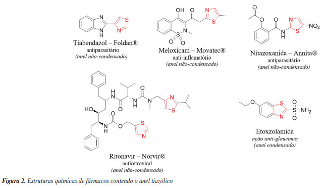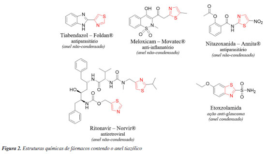 ASPECTOS TEÓRICOS Heterociclo tiazol na química medicinal Alguns estudiosos consideram que os anéis aromáticos são os fragmentos moleculares predominantemente presentes nas moléculas dos fármacos. Além disso, é bastante comum as estruturas dos fármacos exibirem mais de um anel, sendo muitos destes heterocíclicos.2 O tiazol é um heterociclo aromático de 5 membros contendo enxofre e nitrogênio. Trata-se de um importante grupamento heterocíclico que pode ser encontrado na estrutura química de alguns produtos naturais, fármacos comerciais e de vários compostos com atividade biológica determinada experimentalmente.3 Esse grupo também é chamado de núcleo tiazolínico, e exibe grande potencial de aplicação na síntese orgânica, sendo por vezes usado em reações de condensação, oxidação, transformação de grupos funcionais e formação de ligação carbono-carbono.4 Do ponto de vista da Química Medicinal o anel tiazólico pode, algumas vezes, exibir bioisosterismo clássico de anel tanto com o oxazol, que é um heterociclo que apresenta o átomo de oxigênio no lugar do átomo de enxofre, quanto com o imidazol, que é um heterociclo que apresenta o átomo de nitrogênio no lugar do átomo de enxofre.5 O núcleo tiazol pode estar presente na estrutura química de compostos bioativos na forma não-condensada, como nos fármacos tiabendazol, ritonavir, meloxicam e nitazoxanida, ou na forma condensada com outros ciclos, como no fármaco etoxzolamida (Figura 2).6,7