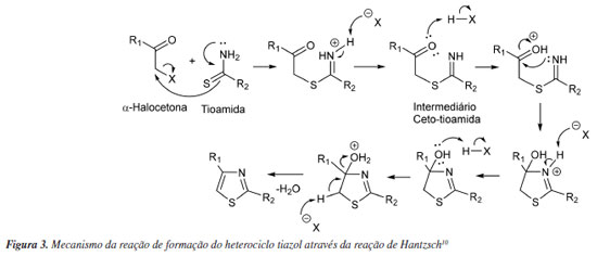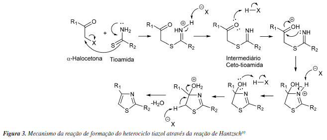 Em termos de atividade biológica o tiazol pode ser considerado uma estrutura privilegiada em Química Medicinal pois, a presença desse núcleo heterocíclico em uma substância de origem natural ou sintética pode ampliar o número de atividades biológicas de interesse.1 É vasta a gama de atividades biológicas que compostos tiazólicos podem exibir, sendo possível encontrar na literatura8 relatos de ação anticâncer, anti-inflamatória, antimicrobiana, antiviral e anticonvulsivante. O heterociclo tiazol pode ser sintetizado por diferentes metodologias, contudo, um exemplo clássico é o emprego da reação de Hantzsch com compostos α-halocarbonílicos. Nesse processo promove-se uma condensação entre uma tioamida e uma α-halocetona, com formação de um intermediário ceto-tioamida, a qual sofre ciclização e posterior desidratação para gerar o anel tiazol (Figura 3).9