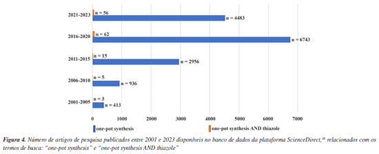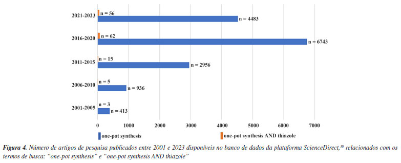 Síntese one-pot A característica básica da síntese one-pot é a obtenção de um produto de síntese almejado através de algumas reações conduzidas em um mesmo frasco reacional, e sem realizar etapa de isolamento de intermediários.11 É válido destacar que essa não é uma estratégia nova em síntese orgânica. No excelente artigo de revisão de Hayashi,12 o autor relata que em 1917 foi descrita a síntese one-pot do alcalóide tropinona por Robert Robinson, a qual tornou-se o marco representativo do emprego inicial desta metodologia sintética. Conforme descrito por Andrade e Mattos,11 uma síntese conduzida de forma one-pot (em um mesmo frasco reacional) pode ter diferentes abordagens, tais como: reações multicomponentes, tandem, cascata, dominó e telescópica; contudo, tais termos não serão detalhados neste trabalho. Métodos de síntese via estratégia one-pot podem conferir algumas vantagens quando comparados com sínteses tradicionais em múltiplas etapas, tais como: redução de custos, de tempo e de energia, devido principalmente à não necessidade de isolamento de intermediários sintéticos; além de melhores rendimentos reacionais devido, novamente, à minimização de perdas em etapas de separação e/ou purificação de intermediários.13 No aspecto ambiental defende-se que a síntese one-pot incorpora alguns princípios da Química Verde, pois contribui para a redução do consumo de solventes e a minimização de resíduos,14 e adota a "economia atômica", uma vez que a quase totalidade dos átomos presentes nos reagentes irão compor a estrutura química do produto final.15 Como desvantagem desse processo podem-se citar que: em diversas vezes não é possível conduzir etapas reacionais distintas e sucessivas sem o isolamento de intermediários sintéticos, bem como, não é possível alterar drasticamente no frasco reator a mistura de solventes e reagentes (e/ou outras substâncias) existentes no meio reacional. Tais fatos tornam a síntese one-pot um desafio para ser implementada com sucesso na prática, requerendo estudos e um planejamento minucioso para moderar a reatividade química em diferentes etapas, escolher taticamente reagentes e solventes para todo o processo, e buscar condições reacionais que minimizem a geração de subprodutos e a ocorrência de reações secundárias.12 Na função de pesquisa avançada usando a base de dados da plataforma ScienceDirect®16 - com os termos "one-pot synthesis" e "one-pot synthesisANDthiazole", com restrição de busca para a presença obrigatória desses termos no título, abstract e/ou palavras-chave - encontrou-se o quantitativo de artigos de pesquisa mostrado na Figura 4. Com esta pesquisa rápida já se constata que o interesse na síntese one-pot, bem como na síntese one-pot especificamente de compostos com o núcleo tiazol, vem aumentando ano a ano, sendo um reflexo provavelmente dos aspectos positivos dessa estratégia sintética, e do potencial farmacológico que esta classe de substâncias pode apresentar. Esta pesquisa bibliográfica também reforça a importância de incentivar a aprendizagem desses temas no ensino superior, considerando a área de Química e afins.