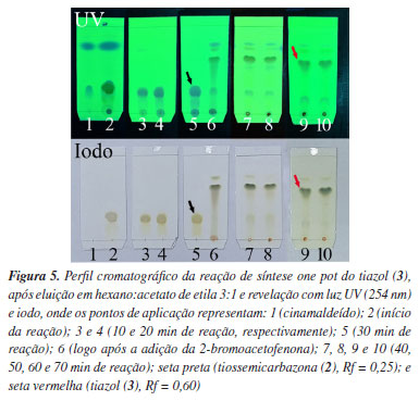 Para fins demonstrativos, o experimento de síntese one-pot do tiazol (3) também foi realizado sob acompanhamento por cromatografia em camada delgada (CCD), a intervalos de tempo pré-definidos (10 min), gerando o perfil reacional demonstrado na Figura 5. O acompanhamento da reação permitiu verificar que 30 min (ponto 5) e 60 min (ponto 9) são suficientes para a reação de formação da tiossemicarbazona (2) (seta preta, Rf (fator de retenção) = 0,25) e tiazol (3) (seta vermelha, Rf = 0,60), respectivamente. A CCD de acompanhamento também revelou: (i) que foram formados alguns subprodutos reacionais (não identificados); (ii) que em 70 min de reação à temperatura ambiente ainda existe resquícios de intermediário reacional (tiossemicarbazona (2)); (iii) que não seria vantagem prolongar demais a etapa da reação de ciclização para além de 30 min (ou 60 min de tempo reacional total), pois provavelmente o ganho extra, em termos de rendimento reacional, não seria significativo. Além disso, a adoção dessa proposta experimental como aula prática poderia ser dificultada caso a reação sob estudo seja prolongada demais.