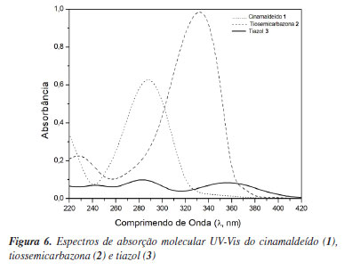 Em ambas as sínteses os rendimentos brutos são muito bons, e tais fatos permitem que tanto a visualização dos produtos quanto a manipulação dos mesmos pelos estudantes sejam facilitadas, já que os sólidos retidos nos papeis de filtro apresentam massas consideráveis, mesmo partindo-se de apenas 1 mmol dos reagentes. Além disso, os procedimentos sintéticos propostos mostram-se simples, rápidos, e de baixo risco e custo, sendo perfeitamente viável reproduzi-los em aulas de graduação, mesmo em laboratórios com poucos recursos materiais. A facilidade de execução dessa proposta experimental pode ainda estimular a introdução dessa atividade prática na sequência regular de experimentos das disciplinas de Química Orgânica, Síntese Orgânica e/ou de Química Medicinal, seja em aulas de graduação ou pós-graduação. É importante deixar claro aos estudantes que também é possível sintetizar o tiazol (3) a partir da tiossemicarbazona (2) empregando-se síntese linear de duas etapas (metodologia descrita no Material Suplementar). Neste caso, o intermediário tiossemicarbazônico deve ser inicialmente sintetizado e separado da mistura reacional, seco e pesado, para só depois proceder com a etapa de ciclização por reação com a 2-bromoacetofenona, seguindo o mecanismo proposto por Hantzsch (Figura 3).10 Contudo, sabe-se que uma desvantagem da síntese linear em múltiplas etapas é justamente uma menor taxa de rendimento, já que a realização de mais procedimentos experimentais em sequência, principalmente se envolver separação (isolamento), geralmente leva a perdas de massa de produtos intermediários e, consequentemente, a um menor rendimento global, o qual é dependente dos rendimentos nas etapas individuais da síntese.17 Novamente, para fins demonstrativos e comparativos, também foi realizada a síntese linear do tiazol (3) em duas etapas, partindo-se da tiossemicarbazona (2) previamente sintetizada e isolada (Material Suplementar). Neste caso, a etapa 1 (síntese da tiossemicarbazona) revelou 79% de rendimento bruto, enquanto que a etapa 2 (síntese do tiazol) revelou um rendimento bruto de 90%, ou seja, menor do que a síntese one-pot produziu, que foi de 99%. Assim, considerando esta síntese linear em duas etapas, o rendimento global (Rg) seria calculado como: Rg = 0,79 (etapa 1) × 0,90 (etapa 2) = 0,711, ou seja, cerca de 71%. Ao explicar tais cálculos o professor deve deixar claro aos estudantes que esses rendimentos foram todos obtidos sem realizar purificações do intermediário e do produto final e que, portanto, o rendimento global seria menor que 71% se fossem feitos os cálculos com os produtos de síntese previamente purificados por recristalização ou coluna cromatográfica. Aula prática de caracterização A caracterização da tiossemicarbazona (2) pode mostrar um PF entre 89 e 94 ºC. Silva et al.18 relataram PF para cristais dessa substância entre 110 e 113 ºC. Cabe lembrar que neste experimento o PF foi determinado usando o sólido amorfo como amostra, sem purificação prévia. Já no caso do tiazol (3), o PF pode mostrar uma faixa entre 218 e 221 ºC. A busca estrutural pelo tiazol (3) utilizando o SciFindern (CAS) não mostrou relatos de síntese dessa substância, assim, na literatura científica não foram encontrados dados disponíveis de PF para essa substância. Contudo, Lino et al.19 relataram PF de um análogo do tiazol (3) entre 195 e 197 ºC. Neste caso, no referido análogo, a diferença reside apenas na presença de um átomo de cloro (-Cl), ao invés de um átomo de hidrogênio (-H), na posição para do anel benzênico vizinho ao núcleo tiazólico. Na Figura 1S (Material Suplementar) é possível ver a CCD dos compostos isolados após as reações. Na revelação em UV visualiza-se no ponto de aplicação 1 o perfil cromatográfico do reagente de partida cinamaldeído (1), o qual revela algumas impurezas e a mistura cis e trans, sendo o isômero trans majoritário de acordo com o fornecedor (Rf = 0,73). Já nos pontos de aplicação 2 e 3 nota-se a tiossemicarbazona (2) (Rf = 0,27) e o tiazol (3) (Rf = 0,58), respectivamente. Os alunos devem perceber que o cinamaldeído (1) só é revelado na luz UV (254 nm), sendo quase imperceptível após revelação com iodo. Já os produtos de síntese tornam-se bem evidentes nestes dois reveladores. Essa CCD também mostra que a tiossemicarbazona (2), obtida por síntese tradicional, e o tiazol (3), obtido por síntese one-pot, já são isolados da reação quase puros, sendo que nenhuma etapa de purificação foi realizada previamente à cromatografia. Em termos de solubilidade, a tiossemicarbazona (2) mostra-se solúvel em etanol absoluto, acetona e metanol. Já o tiazol (3) mostra-se solúvel em acetona, parcialmente solúvel em metanol, e pouco solúvel em etanol (principalmente em etanol hidratado). Essa característica é importante pois, na etapa final de síntese one-pot, e durante a lavagem com etanol a 75% (v v-1) em água, é possível remover resíduos de tiossemicarbazona (2) que não reagiram, e assim, obter um produto final mais puro. Na caracterização por espectrofotometria UV-Vis os estudantes devem perceber que o reagente de partida (cinamaldeído (1)), intermediário (tiossemicarbazona (2)) e o produto final (tiazol (3)) possuem perfis de absorção molecular distintos. Na Figura 6, o cinamaldeído (1) mostra uma banda intensa de absorção em torno de 285 nm, sendo provavelmente referente à transição n → π* da carbonila (C=O) da função aldeído em conjugação com a insaturação. A tiossemicarbazona (2) mostra bandas de absorção com máximos em torno de 230 nm (banda K ou transição π → π*) e 335 nm (transição n → π*). Já o tiazol (3) mostra bandas discretas, em relação às bandas das substâncias precursoras, com máximos de absorção em torno de 285 e 355 nm, as quais podem ser oriundas de transições n → π* de pares de elé