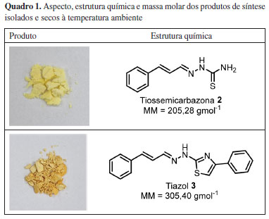 RESULTADOS E DISCUSSÃO Aula prática de síntese Na síntese da tiossemicarbazona (2), derivada do cinamaldeído (1), os estudantes deverão obter nesse procedimento um sólido amarelo claro amorfo. O rendimento reacional bruto de síntese da tiossemicarbazona (2) deverá ser próximo de 79%. Já o tiazol (3) deverá mostrar-se como um sólido laranja claro amorfo quando seco à temperatura ambiente. Quanto ao rendimento reacional bruto na obtenção do tiazol (3) por síntese one-pot, este deverá ser próximo de 99%. Durante essa aula prática os grupos de estudantes deverão perceber que o cinamaldeído (1) (material de partida) é um líquido amarelo à temperatura ambiente, e que os produtos de síntese, tanto a tiossemicarbazona (2) quanto o tiazol (3), são sólidos (Quadro 1). Durante a síntese one-pot o estudante irá perceber no meio reacional uma mudança sutil no aspecto do sólido da tiossemicarbazona (2), que é granuloso e tem maior tamanho de partícula, para um aspecto de sólido fino e de reduzido tamanho de partícula. Este último aspecto se tornará mais evidente quando o tiazol (3) se tornar o componente majoritário na reação. Em termos de coloração também será perceptível um tom de amarelo claro para a tiossemicarbazona (2) (após os 30 min iniciais da reação), e um tom de laranja claro para o tiazol (3) (após os 60 min de reação).