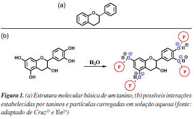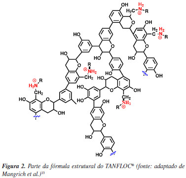 A estrutura dos taninos nos permite dizer que estes compostos exibem características como hidrofobicidade, devido à presença dos anéis aromáticos; hidrofilicidade, devido aos grupos -OH; presença de heterociclos que permitem reações de hidrólise e condensações; e sítios nucleofílicos que podem reagir com compostos orgânicos e metais presentes no meio.22 Entre os taninos mais utilizados para tratamento de água e de efluentes, podemos destacar o TANFLOC®, produzido pela empresa TANAC (Figura 2).8,13,23 O fabricante disponibiliza uma série de diferentes taninos de acordo com o tipo de efluente a ser tratado, sendo o TANFLOC SG considerado o apropriado para o tratamento de efluentes de lavanderias industriais.24