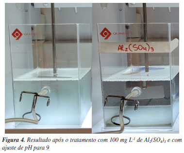 Embora a literatura relate que o sulfato de alumínio atua de modo satisfatório na faixa de pH 5 e 7, optou-se por avaliar, também, o desempenho desse agente químico no pH com valores próximos de 9 devido à natureza alcalina do efluente. Dessa forma, foi possível realizar o tratamento utilizando o menor volume de ácido sulfúrico possível, conforme também realizado por Zotesso et al.10 Após a realização de 7 ensaios utilizando o Al2(SO4)3 como coagulante, observou-se que, neste trabalho, a concentração ideal de Al2(SO4)3 encontrada para esse efluente foi igual à encontrada por Zotesso et al.,10 em 2015, onde 100 mg L-1 também foram suficientes para o tratamento do efluente de uma lavanderia hospitalar no processo de coagulação/floculação. A concentração ideal obtida para o Al2(SO4)3 permitiu observar uma remoção de cor e turbidez igual a 97,41 e 93,95%, respectivamente. Foi observada uma redução de 36,85% da condutividade, indicando a remoção de contaminantes químicos do efluente tratado e a remoção de 35,62% dos sólidos totais, sendo que 100% dos sólidos suspensos foram removidos após o período de sedimentação. Esse tratamento reduziu em mais da metade o teor de matéria orgânica, uma remoção de 55,52% de DQO foi encontrada para o efluente tratado. O sulfato de alumínio, durante o tratamento, consome naturalmente os constituintes da alcalinidade como os bicarbonatos, carbonatos e hidróxidos, o que promove a redução desse parâmetro e, consequentemente, a redução do pH do meio, segundo Coral et al.45 Para o presente trabalho, houve uma redução significativa de pH e a remoção de alcalinidade foi de 79,83%. O efluente após o tratamento com 100 mg L-1 de Al2(SO4)3 pode ser visualizado através da Figura 4.