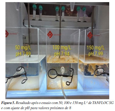 Como resultado, o pH 6 e concentração de 50 mg L-1 de tanino foi a condição de maior eficiência na remoção da cor aparente (84,36%) e da turbidez (89,75%). Essa dosagem foi semelhante à encontrada por Trevisan41 que concluiu através de seu estudo que 45 mg L-1 de TANFLOC SG foi a melhor concentração para tratar água com valores de cor aparente e turbidez elevados, atendendo ao padrão organoléptico da Portaria No. 2.914/201146 do Ministério da Saúde. Foi verificado um aumento da DQO no efluente pós-tratamento, o que nos leva a inferir que parte da matéria orgânica presente nesse coagulante não foi removida junto aos flocos, contribuindo para a carga de matéria orgânica solúvel do efluente. Para esse coagulante, a condutividade do efluente tratado aumentou ligeiramente em comparação ao efluente bruto. Vale ressaltar que, após tratamento, não foram observadas mudanças no pH, e que, diferente do sulfato de alumínio, foi observada a flotação dos flocos quando aplicadas concentrações superiores a 50 mg L-1. A Figura 5, referente ao primeiro ensaio com esse coagulante, evidencia essa característica.