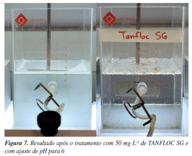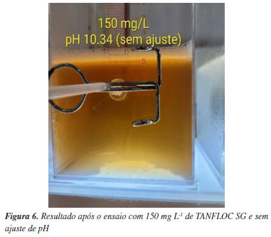 Esse resultado corrobora com a recomendação do fabricante no que se refere a faixa ótima de pH. O efluente tratado com 50 mg L-1 de TANFLOC SG, em pH 6 pode ser observado por meio da Figura 7.