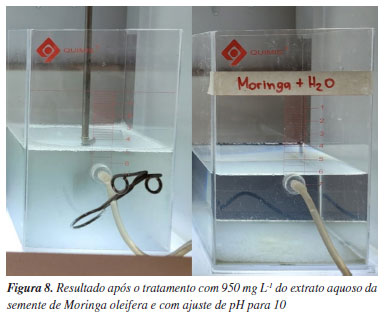 O pH do efluente foi ajustado para 10 para que houvesse um padrão de comparação com as demais metodologias aplicadas na utilização da semente de Moringa oleifera. Após o tratamento do efluente, foi possível observar que a semente de moringa também não causou alterações significativas no valor do pH em cada ensaio. O melhor resultado, concentração 950 mg L-1, foi obtido através da terceira metodologia, onde o extrato aquoso das sementes foi utilizado como coagulante. O valor encontrado é próximo ao obtido por Ndabigengesere e Narasiah,43 em 1998, que encontraram as dosagens ótimas entre 500 e 1000 mg L-1 para o tratamento de efluentes domésticos e industriais realizados em seu trabalho. Os autores também utilizaram o extrato aquoso a 5% de sementes de Moringa oleifera. O efluente tratado com 950 mg L-1 do extrato aquoso da semente de Moringa oleifera pode ser observado através da Figura 8.