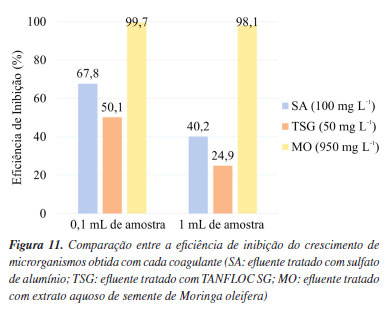 Conforme observado na Figura 11, tem-se que ao final das 48 h de incubação, o efluente tratado com as sementes de Moringa oleifera agitadas em água garantiu uma inibição de 99,7 e 98,1% no crescimento de microrganismos para as placas cultivadas com 0,1 mL e 1 mL de amostra, respectivamente. Já para os tratamentos realizados com sulfato de alumínio e tanino, os resultados não foram satisfatórios.