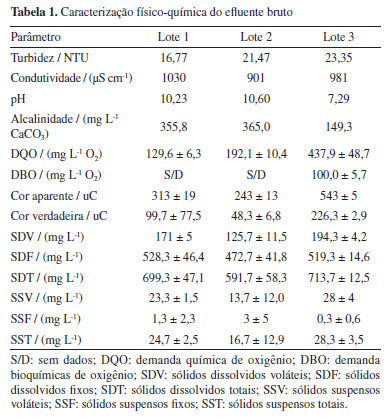 RESULTADOS E DISCUSSÃO Antes de iniciar os testes em cada novo lote de efluente, foi realizada a caracterização deste de modo a garantir a reprodutibilidade dos tratamentos. A Tabela 1 permite comparar as características iniciais de cada um dos lotes trabalhados.