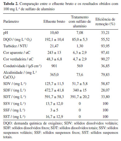 A partir dos resultados apresentados na Tabela 1, foi possível delinear o melhor tratamento aplicável aos 3 lotes. Primeiramente, o sulfato de alumínio foi testado como tratamento para o efluente de lavanderia hospitalar. Durante os ensaios sem ajuste de pH, foram observadas altas remoções turbidez (acima de 90%) para as concentrações de 250 e 400 mg L-1. Escolheu-se 250 mg L-1 como a melhor dosagem (menor custo) para continuidade dos testes. Dentre os valores de pH avaliados, os resultados obtidos com pH 5 e pH 7 não foram satisfatórios quanto os resultados em pH 9, em termos de remoção de turbidez, cuja remoção foi de 92%. Portanto, os últimos ensaios tendo como coagulante o sulfato de alumínio, foram realizados com pH 9. Pode-se verificar os resultados após cada ensaio nas Tabelas 1S e 2S do Material Suplementar. A Tabela 2 apresenta o melhor resultado obtido (100 mg L-1) com o coagulante químico.