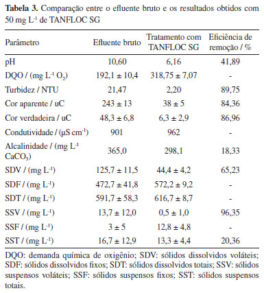 Após finalizados os testes com sulfato de alumínio, iniciou-se os testes utilizando o coagulante tipo tanino. De acordo com recomendações do fabricante, o coagulante utilizado (TANFLOC SG) é efetivo na faixa de pH variando entre 4,5 e 8.24 Sendo assim, os testes ocorreram com ajustes de pH dentro da faixa recomendada em três concentrações distintas (50, 100 e 150 mg L-1). Foi observado que, na concentração de 50 mg L-1, em pH 6, a remoção de turbidez foi de 90%, semelhante as concentrações de 100 mg L-1 e 150 mg L-1, que foram 92 e 93%, respectivamente. Devido ao custo/benefício, optou-se pela menor concentração. Pode-se verificar os resultados após cada ensaio nas Tabelas 3S e 4S do Material Suplementar. Os valores dos parâmetros antes e após o tratamento da melhor condição estão expostos na Tabela 3.