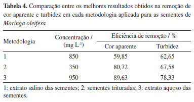 Por fim, as sementes de moringa foram testadas como coagulante. Após consulta em literatura, decidiu-se testar três metodologias para aplicação da semente de moringa no tratamento físico-químico do efluente de lavanderia hospitalar: extraída em solução salina, semente pura e extraída em água. Partindo de uma concentração de 50 mg L-1 do extrato salino, foi observado o aumento dos parâmetros de turbidez e cor aparente do efluente tratado. Com esses resultados, foi necessário verificar maiores concentrações do extrato, chegando a 950 mg L-1. A dosagem que resultou na melhor remoção de turbidez (63%) foi de 850 mg L-1, sem ajuste de pH. Ao aplicar diretamente como coagulante as sementes trituradas, a melhor concentração foi de 350 mg L-1, resultando numa remoção de 68% de turbidez, sem ajuste de pH. Os resultados de todos os ensaios podem ser verificados nas Tabelas 5S a 8S do Material Suplementar. Como última metodologia empregada para utilização da semente de moringa como agente coagulante, aplicou-se o extrato aquoso. A concentração de 950 mg L-1, foi a que apresentou o melhor resultado dos parâmetros analisados, sobretudo na remoção da turbidez do efluente (78%). A Tabela 4 apresenta os melhores resultados obtidos para remoção de cor e turbidez para cada metodologia aplicada para o preparo das sementes de Moringa oleifera utilizadas no tratamento do terceiro lote de efluente bruto.