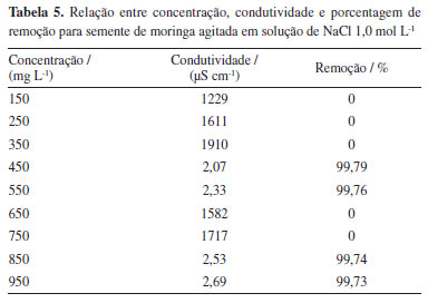 De acordo com a Tabela 4, é possível verificar que a metodologia 2 (semente triturada) foi a que demandou menor concentração de coagulante, entretanto, resultou em remoção menor que 70% de turbidez. Nesse sentido, o melhor resultado foi atingido ao se utilizar a metodologia 3, onde o extrato aquoso foi empregado, na concentração de 950 mg L-1, que resultou em remoção de turbidez próxima a 80%. Para comparar os resultados entre a mesma concentração para diferentes metodologias, pode-se consultar o Quadro 1S do Material Suplementar. Embora as concentrações requeridas para o tratamento com a moringa serem consideravelmente maiores que as dos demais coagulantes, ressalta-se a sua grande atividade antimicrobiana, o que é um fator positivo para um efluente de origem hospitalar. Dentre as metodologias avaliadas, o uso da semente de moringa em solução de NaCl 1,0 mol L-1 apresentou alta taxa de remoção de condutividade, ao avaliar o valor da condutividade do efluente bruto e tratado. Diversos resultados apresentaram uma eficiência maior que 99% na remoção de condutividade, essa relação pode ser verificada na Tabela 5.