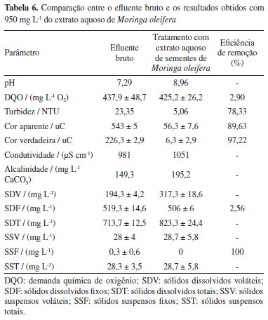 Essa eficiência na remoção da condutividade pode ser explicada pela presença de proteínas catiônicas e polieletrólitos presentes na semente de Moringa oleifera. Ambos atuam neutralizando as cargas das partículas presentes no efluente.32,33,36,47,48 Para os resultados supracitados, nota-se que não é possível obter uma linearidade entre a concentração e remoção de condutividade. Entretanto, esse resultado pode ser corroborado pelo trabalho de Olabimtan et al.,49 onde 30 mg L-1 conferiram uma redução de 86,28% desse parâmetro em um efluente de lavanderia comercial. Araújo etal.27 também obtiveram resultados satisfatórios ao utilizar o extrato da semente de Moringa oleifera em água destilada, conferindo uma remoção de 57,50% de condutividade ao final do tratamento. Com isso, o resultado apresentado na literatura vem de encontro com o presente trabalho. Entretanto, destaca-se que os dados referentes a essa queda brusca de condutividade ainda devem ser investigados, posto que na literatura ainda não há registros acerca do mecanismo de ação das sementes. A diminuição da condutividade presente em um efluente é considerada importante porque esse parâmetro é considerado um indicativo da presença de contaminantes iônicos no meio.50 Esse parâmetro é utilizado no controle de poluição de rios e lagoas para avaliação de possíveis impactos ambientais provocados pelo lançamento indevido de efluentes industriais.47 Logo, uma condutividade baixa pode nos permitir dizer que o efluente tratado possui uma baixa carga de contaminantes químicos. Para o efluente de lavanderia hospitalar, espera-se como poluentes químicos os íons oriundos da dissociação dos produtos químicos utilizados no processo de lavagem de roupas como, por exemplo, alvejantes, detergentes e amaciantes.5 Além disso, também existe a possibilidade da contaminação por fármacos, presentes em virtude do material excretado pelos pacientes nas roupas ou através da manipulação profissional. Para as três metodologias, é possível observar os resultados completos após cada ensaio no Material Suplementar, Tabelas 5S a 10S. Os resultados obtidos com o extrato aquoso de Moringa oleifera podem ser observados na Tabela 6.